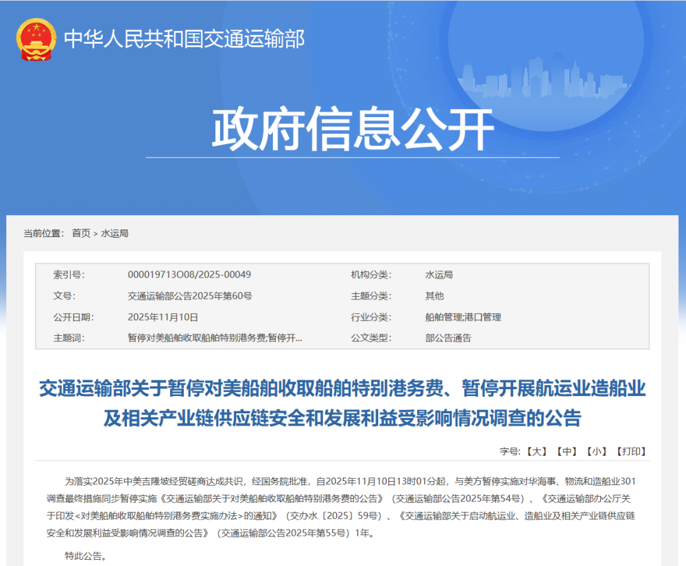 为落实2025年中美吉隆坡经贸磋商达成共识,经国务院批准,自2025年11月10日13时01分起,与美方暂停实施对华海事、物流和造船业301调查最终措施同步暂停实施《交通运输部关于对美船舶收取船舶特别港务费的公告》(交通运输部公告2025年第54号)、《交通运输部办公厅关于印发<对美船舶收取船舶特别港务费实施办法>的通知》(交办水〔2025〕59号)、《交通运输部关于启动航运业、造船业及相关产业链供应链安全和发展利益受影响情况调查的公告》(交通运输部公告2025年第55号)1年。