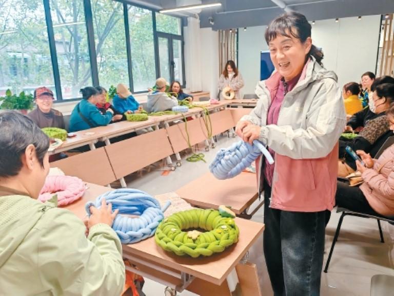编织手工课现场,居民们互相交流技巧,指尖的毛线渐渐“织”出趣味与温情。