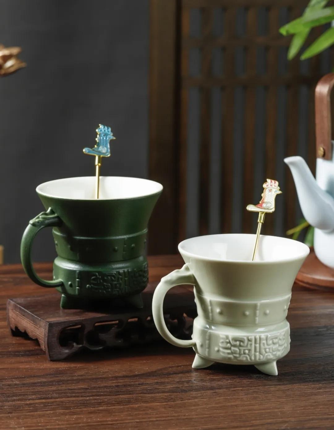 荣获铜奖的“飞凰腾达”咖啡杯以馆藏青铜器凤柱斝为灵感来源,将这一古代饮酒器的造型与现代咖啡杯的实用功能有机融合。凤鸟纹元素被巧妙提炼为搅拌棒——灵动的神鸟纹饰经现代工艺重新演绎,在保留传统纹样美学特征的基础上,更添一份俏皮活泼的使用趣味。