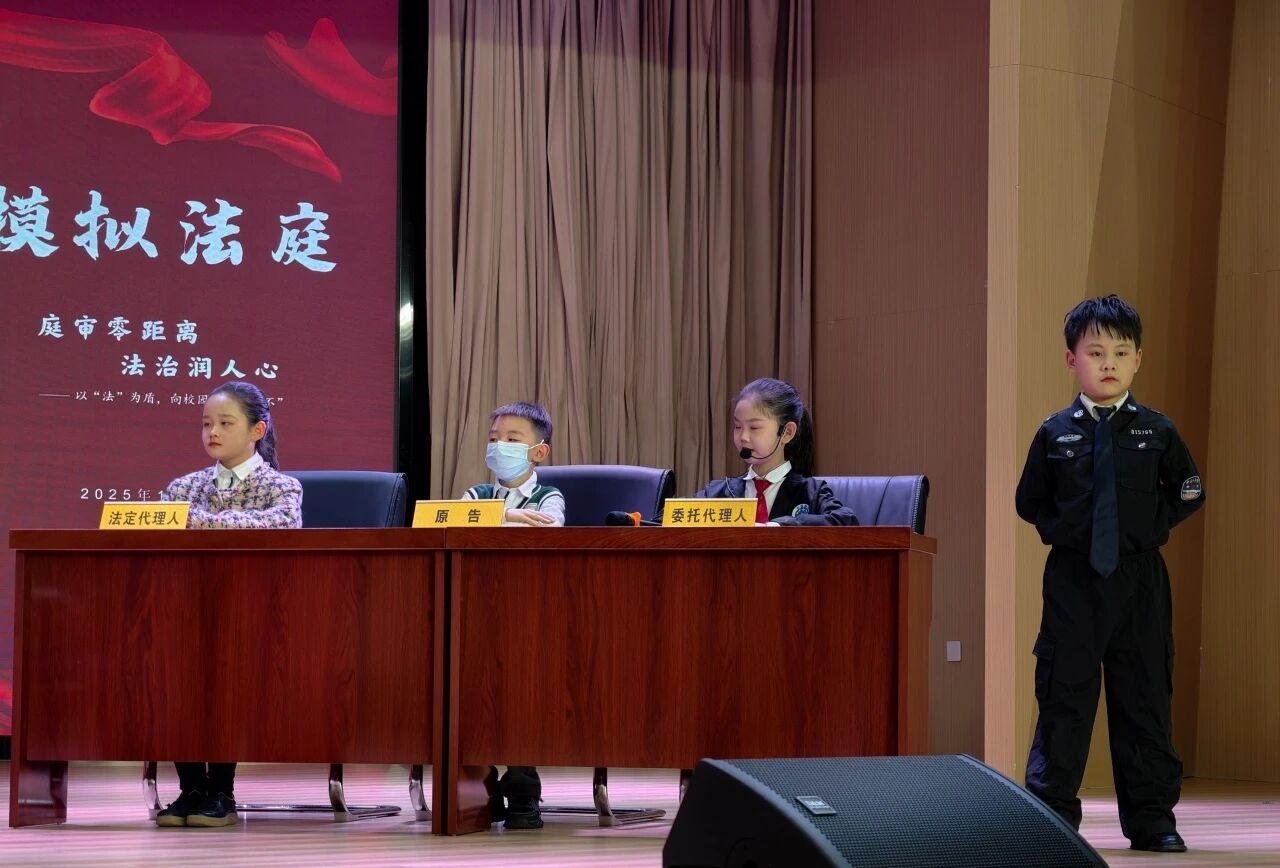 本次模拟法庭选取一起典型校园欺凌案件作为背景,学生们分别扮演审判长、人民陪审员、当事人、诉讼代理人等角色,严格按照法定程序,完整呈现了法庭调查、举证质证、法庭辩论、法庭宣告等案件审理全过程。整个流程有条不紊、氛围严肃规范。