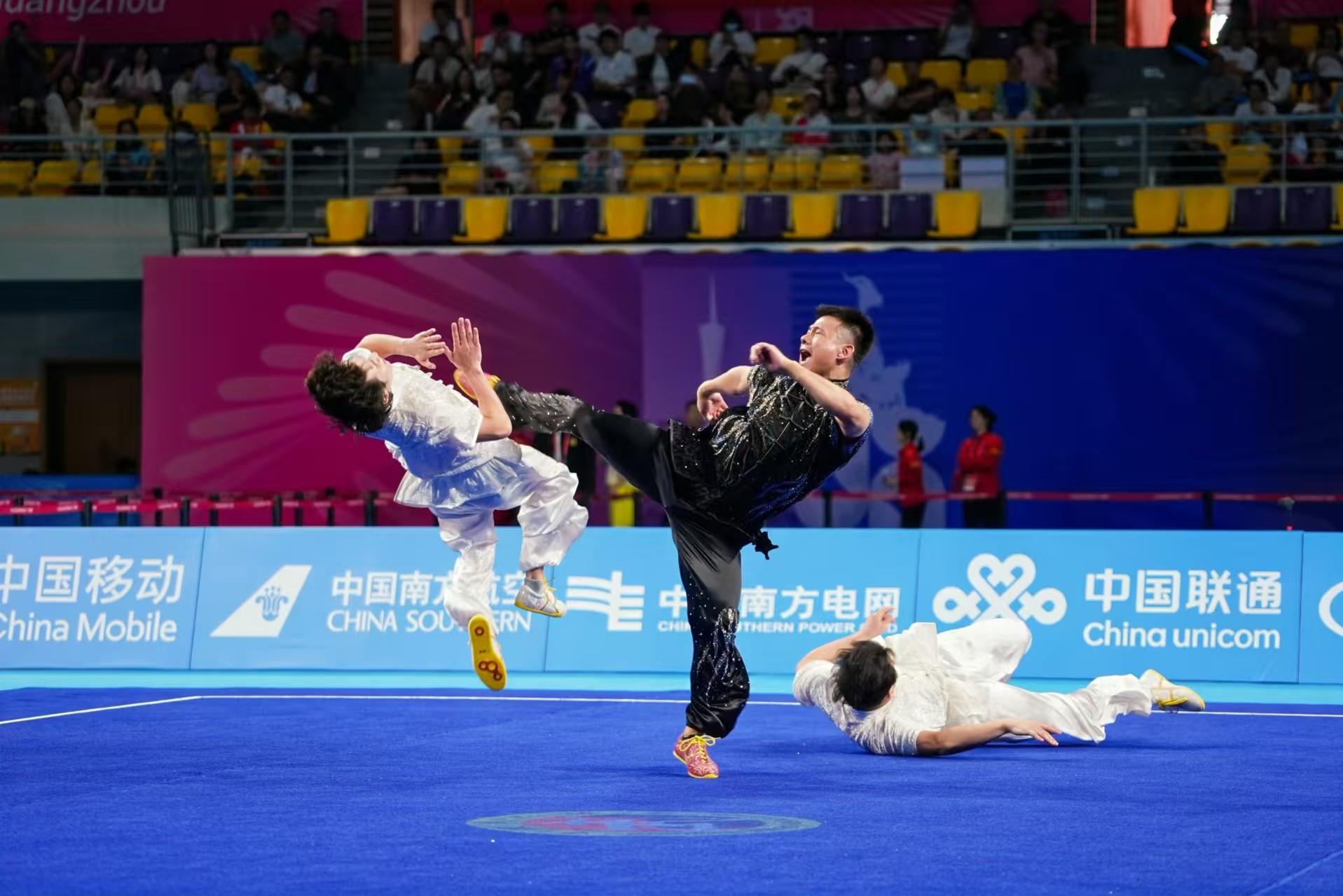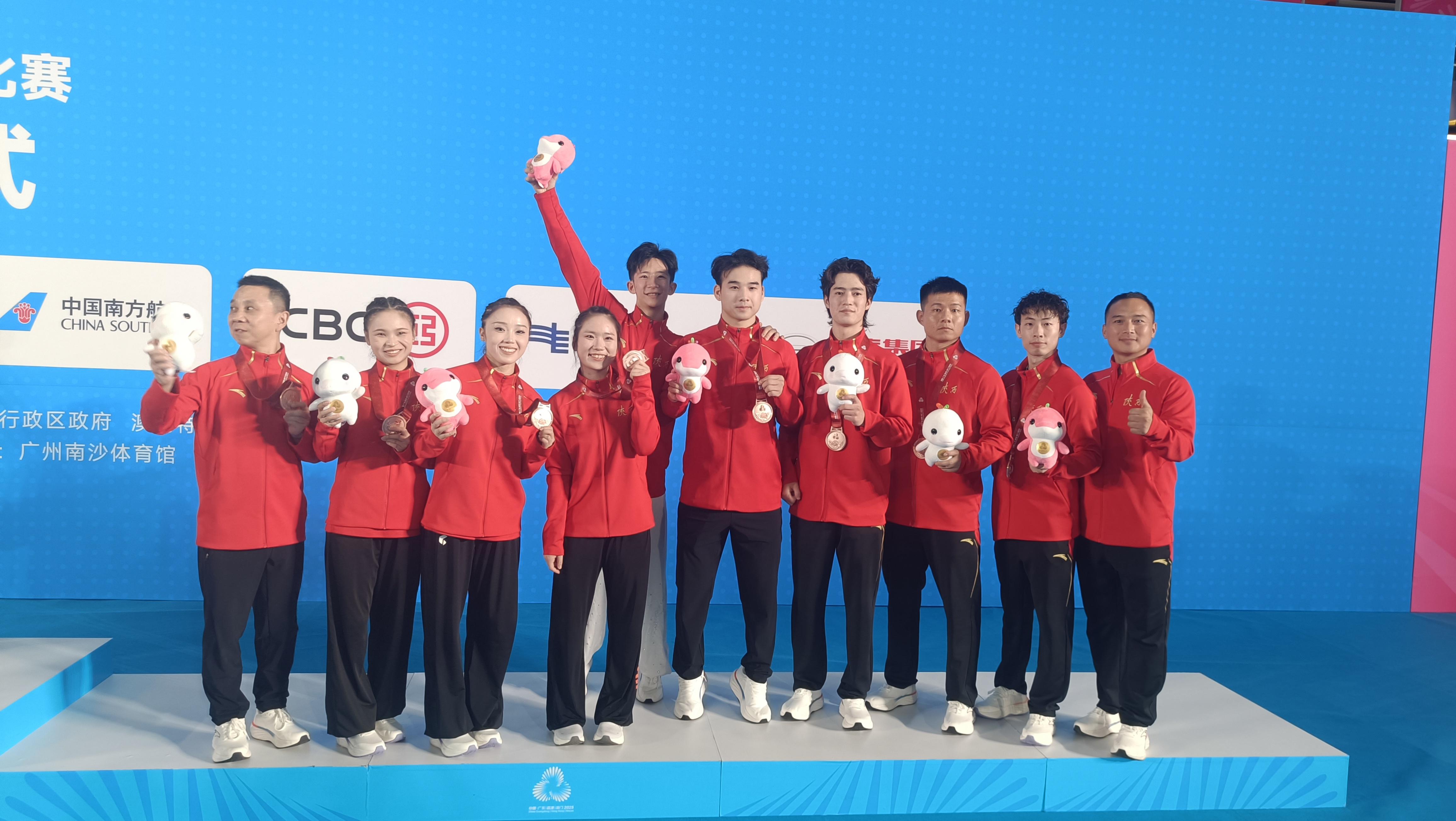 在陕西队的优势项目男子三人徒手对练比赛中,郑海涛、耿明浩、王佳强配合默契,踢打摔翻扑一气呵成,收获9.700分。陈颖与张寒松在女子二人器械对练中动作协调、攻防有度,以9.693分顺利完赛。6个单项零失误的稳定发挥,让陕西队最终锁定这枚铜牌