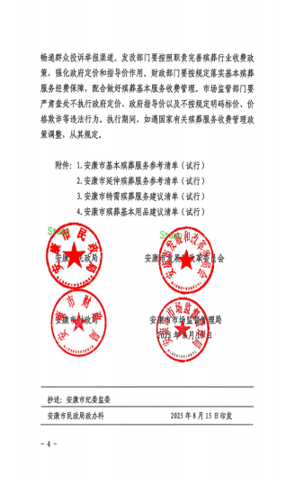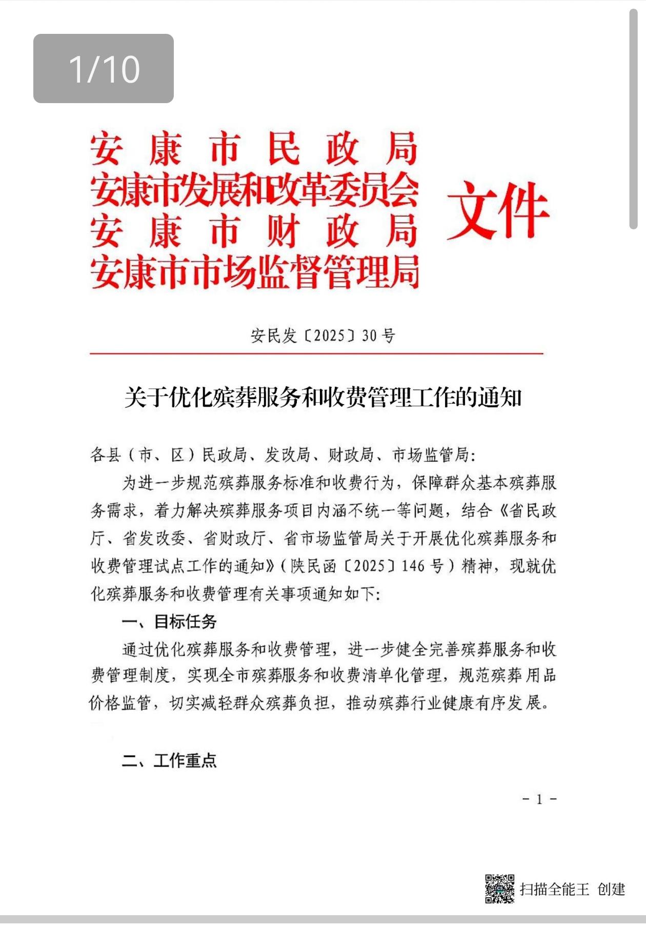 图为安康市民政局、发展和改革委员会、财政局、市场监管局《关于优化殡葬服务和收费管理工作的通知》