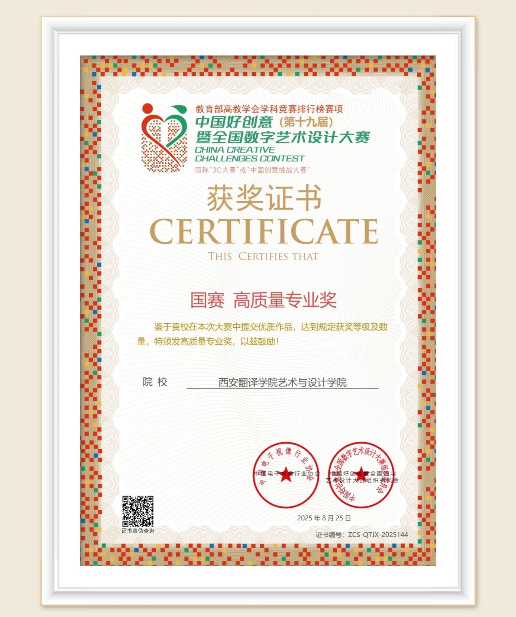 三秦都市报-三秦网讯(记者 吕云涛)11月7日至9日,第十九届中国数字传媒教育与发展论坛年会暨第十九届中国好创意暨全国数字艺术设计大赛全国总决赛颁奖典礼在成都东软学院举行。西安翻译学院在本届大赛中表现亮眼,荣获全国奖项39项,其中一等奖8项、二等奖 10 项、三等奖 20 项,同时荣获“国赛高质量专业奖”,创下学校在该赛事中的历史最佳成绩。