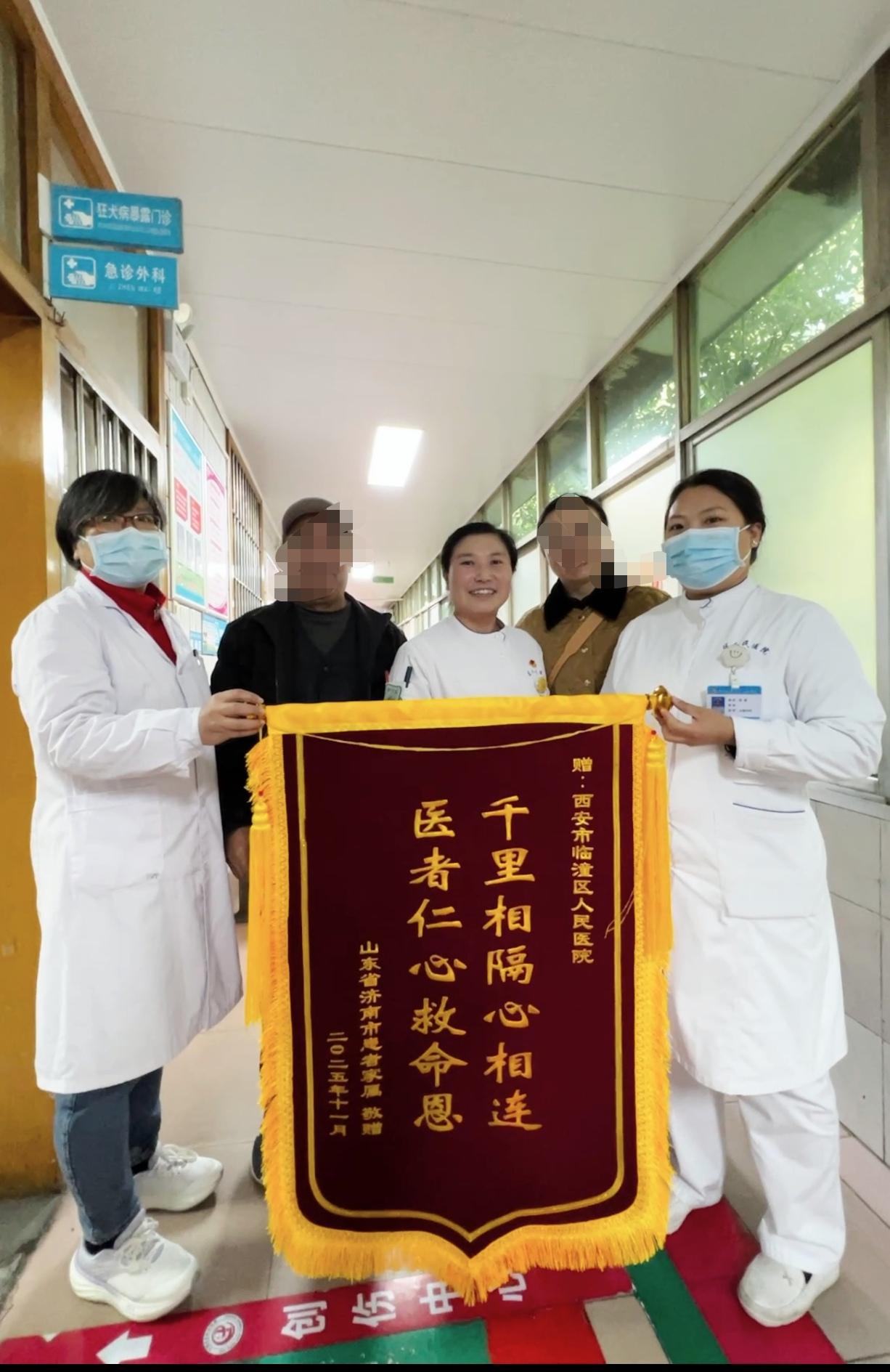 三秦都市报-三秦网讯(记者 文晨 通讯员 王三合)11月7日,一位从山东济南专程赶来的患者家属,将一面写有“千里相隔心相连,医者仁心救命恩”深情寄语的锦旗,送到西安市临潼区人民医院医护人员手中。