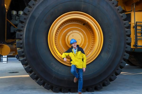外籍视频博主在徐工集团巨型起重机械的车轮前合影