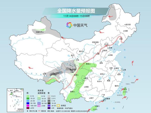 明天,新疆北部、内蒙古东北部、西藏南部和东部、西北地区中部、甘肃南部、西南地区北部、四川盆地西南部等地部分地区有小雪或雨夹雪,其中,西藏东部、川西高原北部等地部分地区有中到大雪。西藏南部、甘肃南部、陕西中南部、河南西部、四川盆地中东部和西部、重庆西部、贵州西北部、云南中东部和西南部、海南岛、台湾岛等地部分地区有小雨。