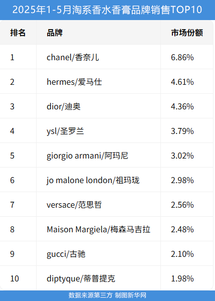 这一态势在香水品类的重要销售渠道淘系平台(淘宝+天猫)的数据中也有所体现。国际大牌牢牢占据淘系平台香水品牌销售前十。数据显示,2025年1-5月,榜单前十仍由香奈儿、圣罗兰、祖玛珑等国际大牌垄断。