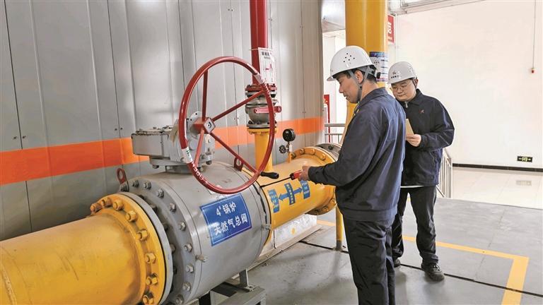 十一月七日,西安城投热力集团雁东(供热)公司生产运行室第四值班组工作人员检查天然气锅炉设备。