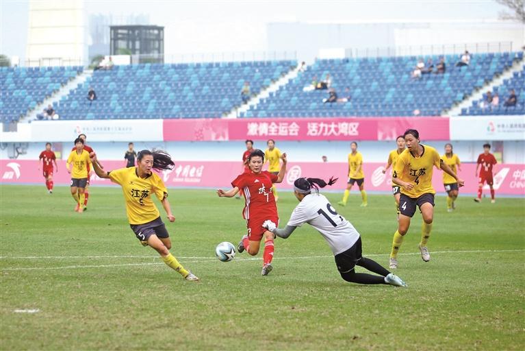 11月8日,陕西女足(红色球衣)迎战江苏女足。陕西女足攻防有序、顽强拼搏,最终晋级十五运会足球项目女子成年组八强。