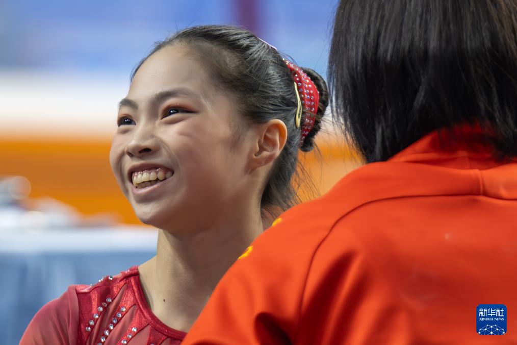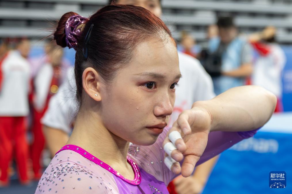 11月13日,湖北队选手昌若涵在高低杠比赛后。