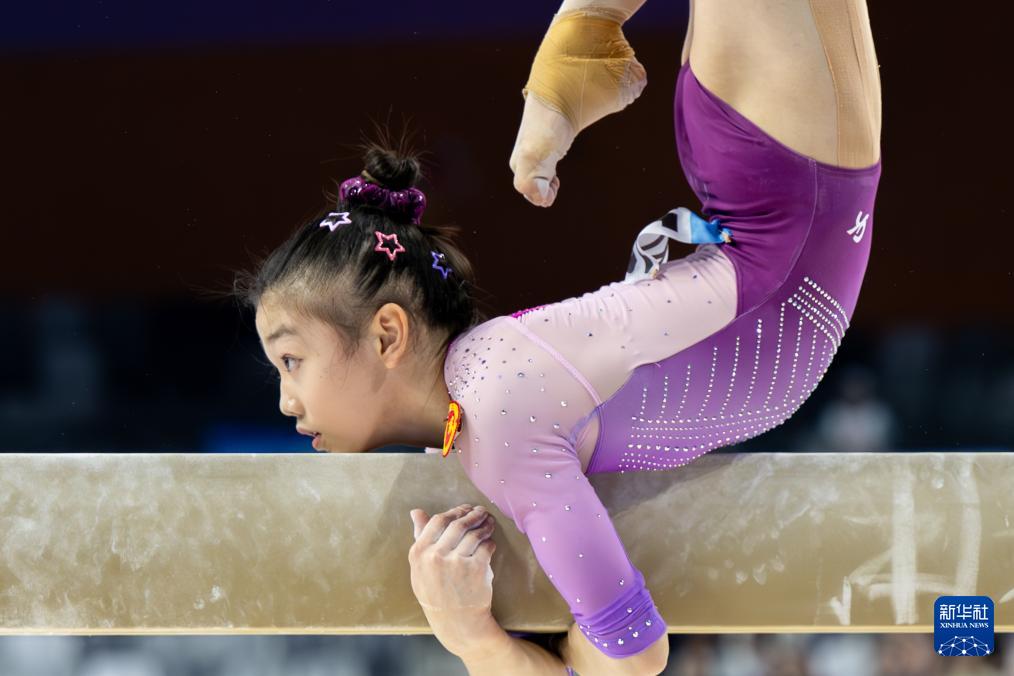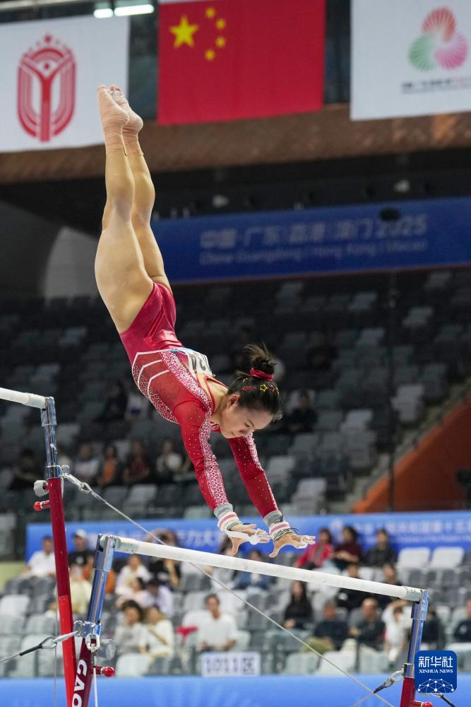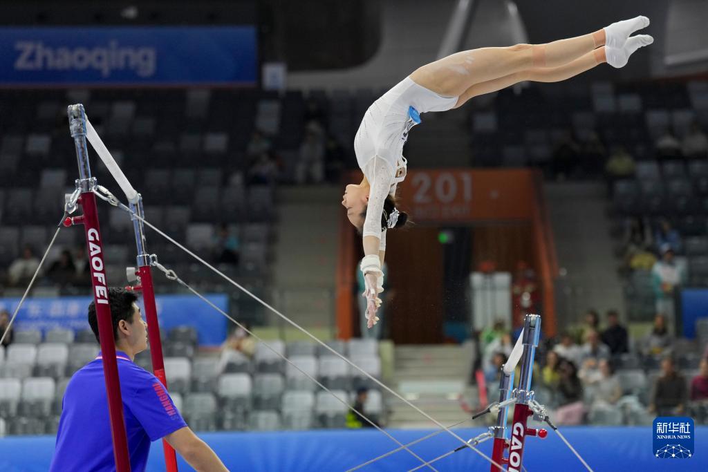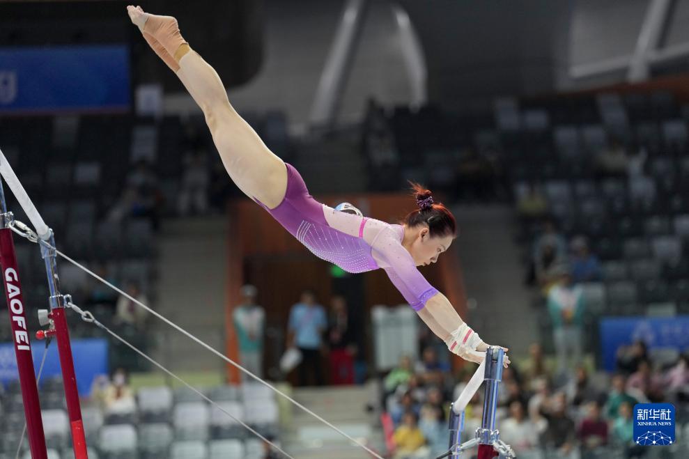 11月13日,广东队选手欧钰珊在高低杠比赛中。