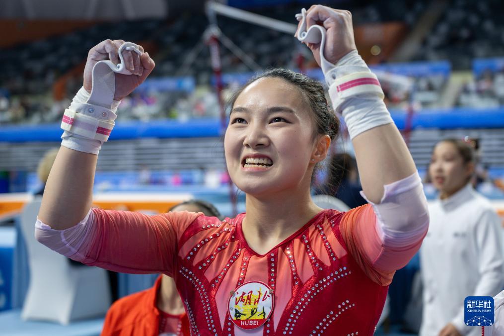 11月13日,湖北队选手赵佳怡在高低杠比赛后庆祝。