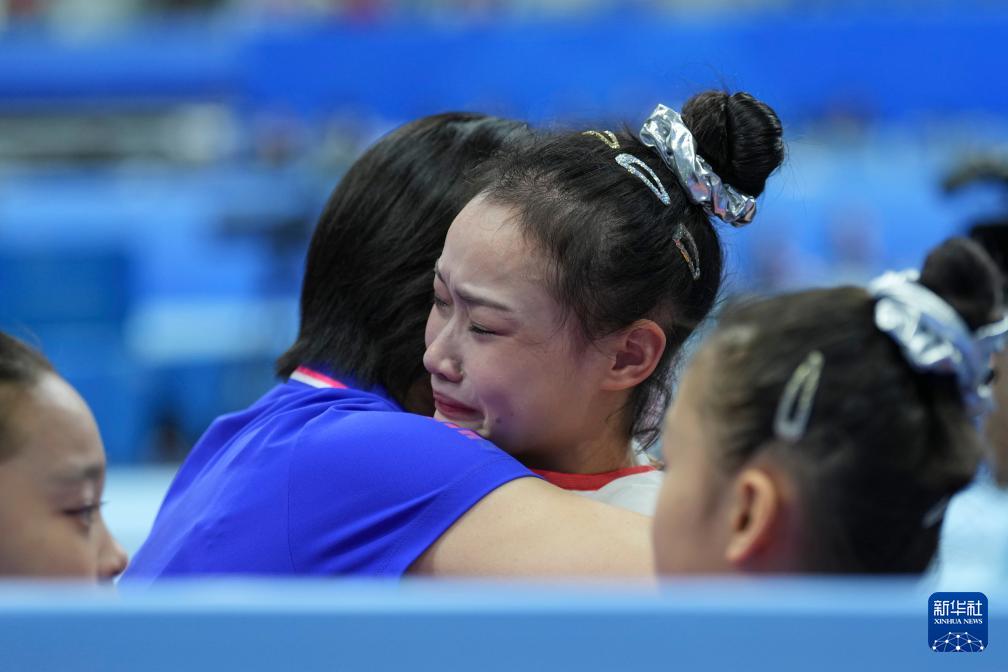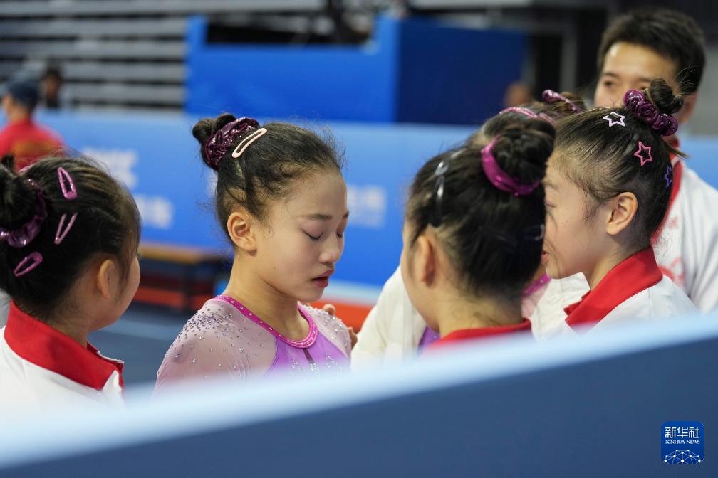 11月13日,广东队选手钟圻(左二)在场边恢复情绪,她在平衡木比赛中失误。