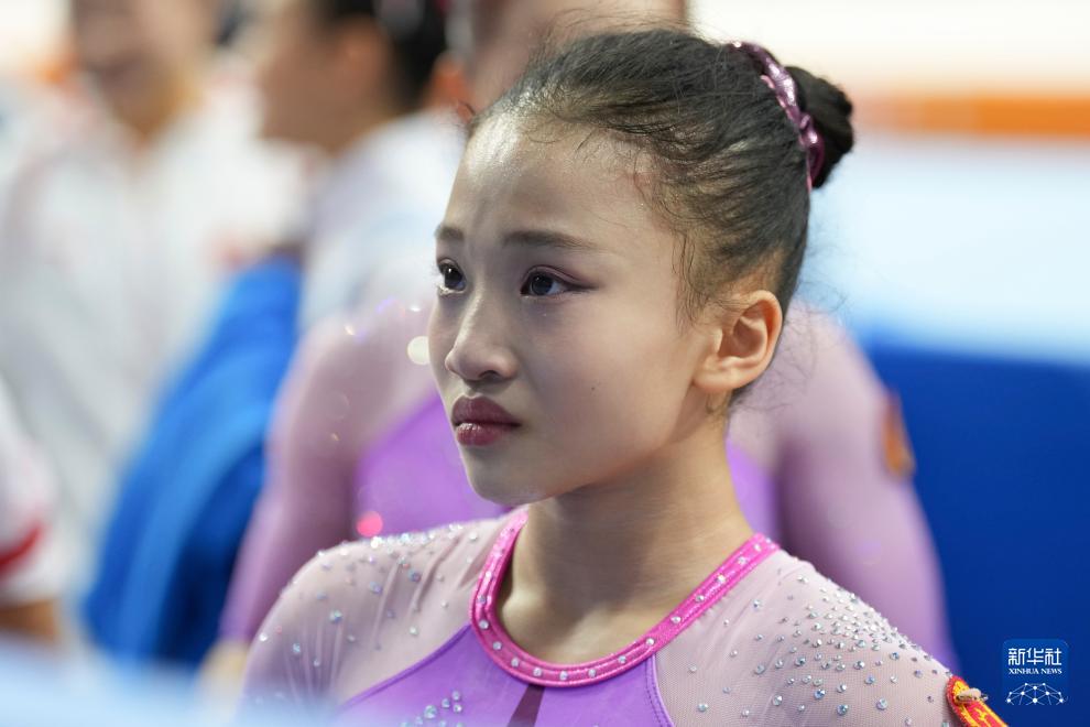 11月13日,广东队选手钟圻在场边恢复情绪,她在平衡木比赛中失误。
