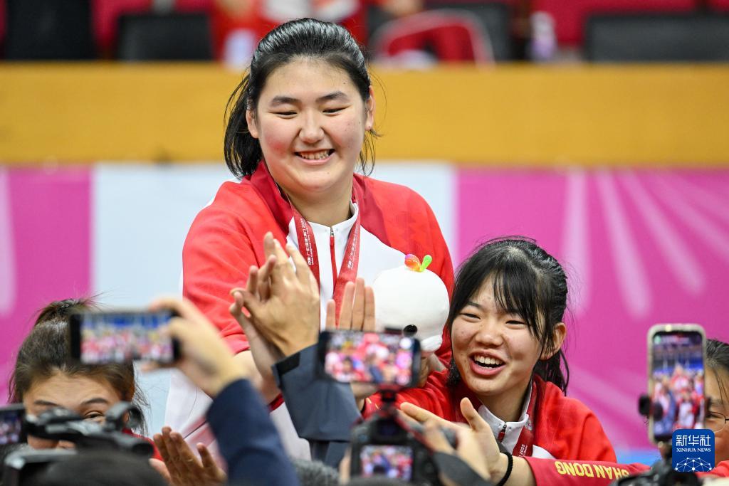 11月13日,山东队球员张子宇(左)、李希诺和队友庆祝夺冠。