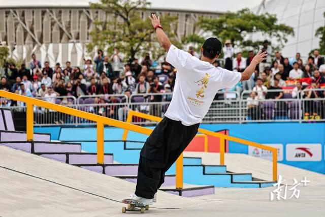 11月11日下午,十五运会滑板项目男子街式决赛,广东队潘家杰完成高难度动作后展开双臂与欢呼的观众们互动。郑新洽 摄