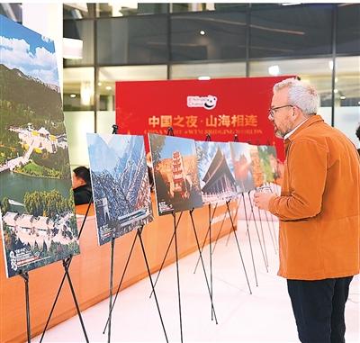 外国来宾现场观看“你好!中国”2025世界文化遗产主题旅游海外推广季图片展。