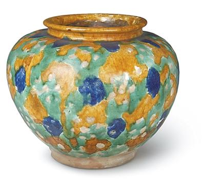 唐三彩是低温釉陶器,以鲜艳的黄色、绿色、白色为主,是唐代对外输出的重要商品之一。展品使用的蓝色釉料由丝绸之路带入中原地区,釉色绚丽,造型多元,体现了丝绸之路文化交流形成的多元审美,也反映了中华文明的开放包容。