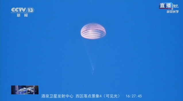 目前,神舟二十一号载人飞船返回舱主降落伞已打开,正在着陆。