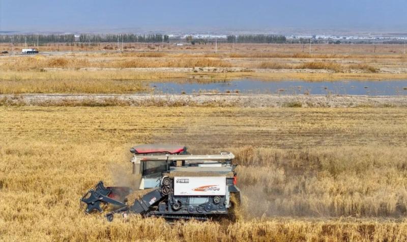 大马力收割机来回穿梭收割水稻。图/铁门关在线微信公众号