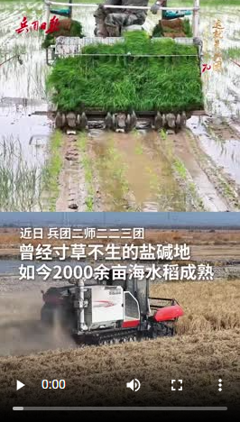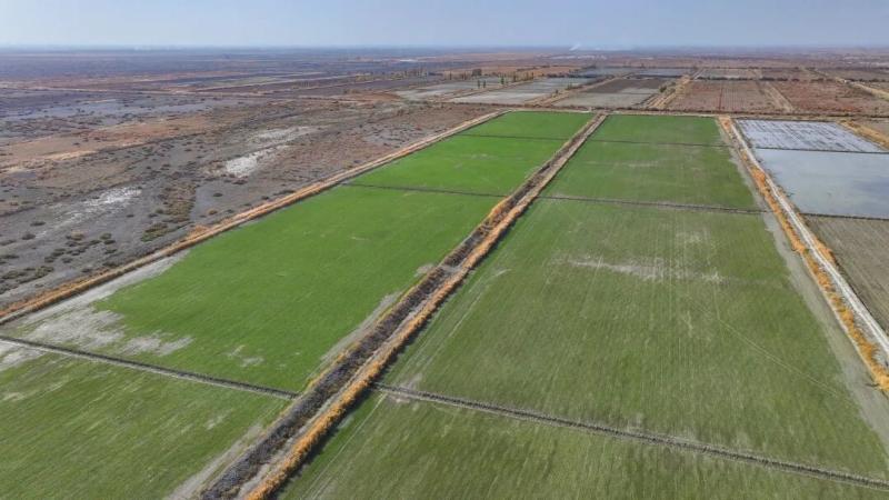 二二三团地处天山南坡,土壤表层盐壳最深可达40—50厘米,平均厚度20厘米,含盐量一度高达千分之二十四。2022年,当地与袁隆平青岛海水稻研发团队合作,启动系统化治理。