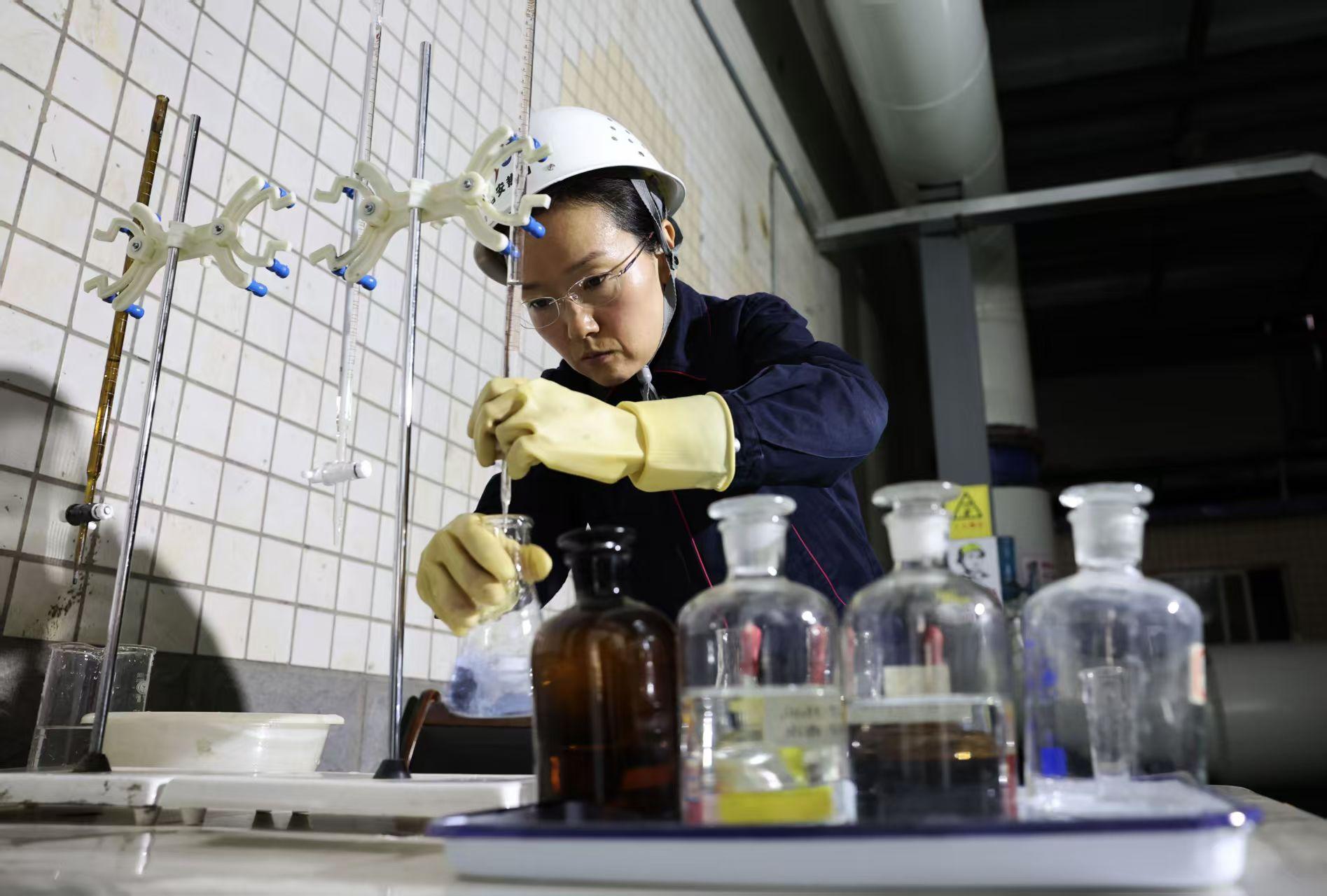 在检测区域,水质检验员刘博庆将采样的水倒进三个量杯,滴入专用试剂,不一会儿三杯水便分别呈现出对应的颜色。随后,她将水质硬度、pH值等数据记录到本子上。
