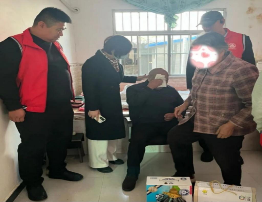 在村干部的带领下,慰问组成员刘旭东、岳江澎等人逐户登门,将米、面、油等生活物资送到困难群众手中。在一位患病村民的床前,慰问人员俯身轻语、目光关切,一句句暖心问候传递着深情厚意。