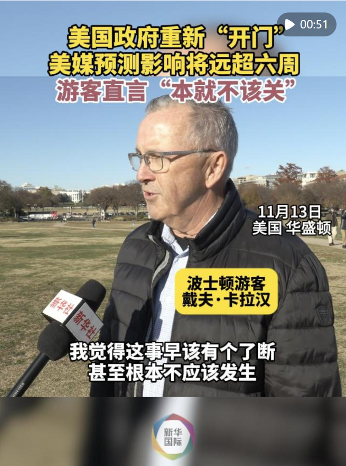 11月13日是持续43天的美国政府“停摆”结束后的第一天。新华社记者在首都华盛顿特区看到,华盛顿纪念碑暂未开放,但周边游客络绎不绝。当被问及对政府重新“开门”的感受时,有人直言“太好了”,有人表示“总算松了一口气”,也有人抱怨“本来就不该关门!”