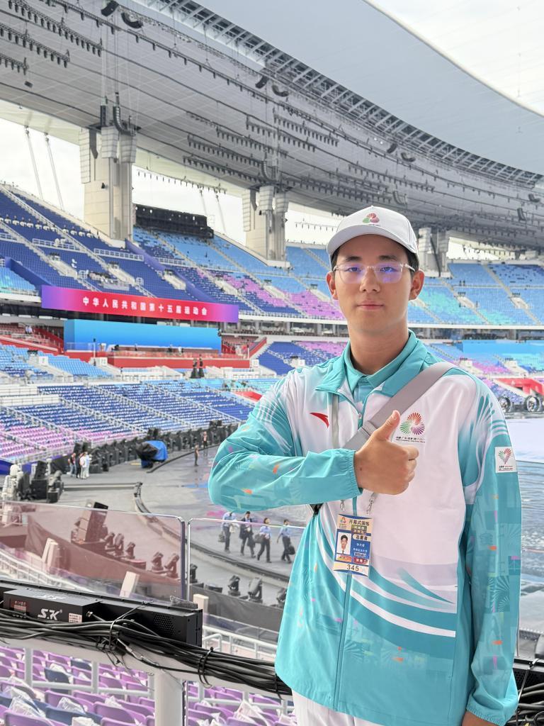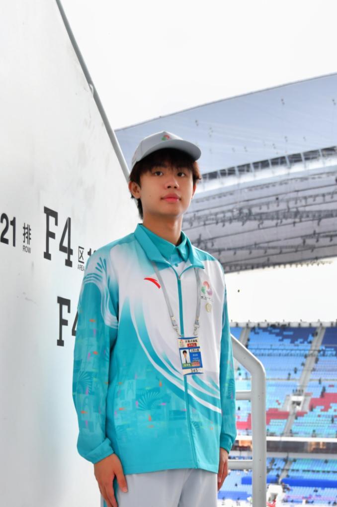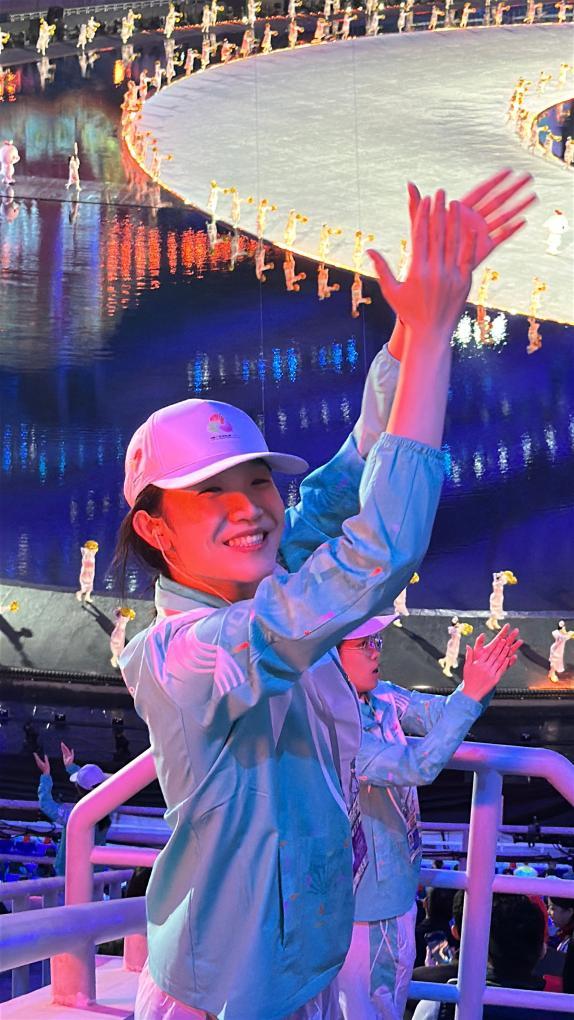 作为看台区志愿者,姚正诺不仅要为观众指引路线、解答疑问,还要维持场内秩序,与仪式展演团队协作充当“暖场助手”。“我们要做现场情绪调动的‘显眼包’,暖心的是,现场观众都很热情地回应我们。”她说,更感动的是,看台上一位观众还给她拍了一张美美的“工作照”发到了社交平台上,“正是大家都站好每一班岗,才有了这样完美的收获。”