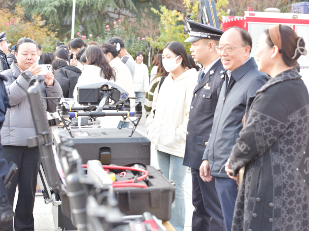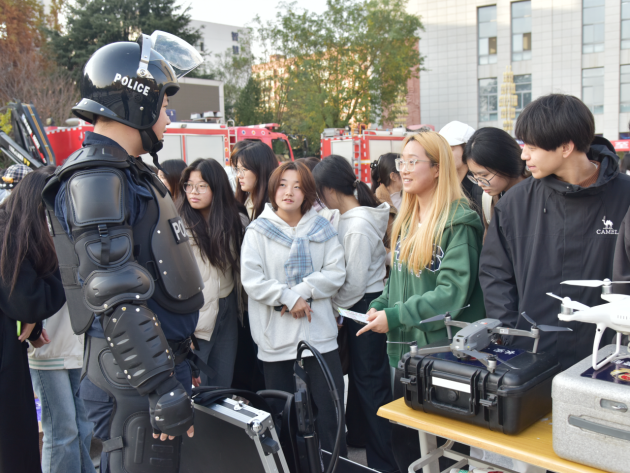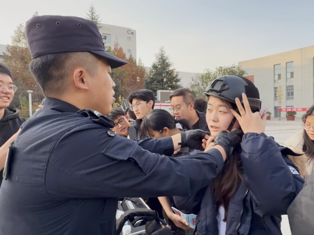 随后,现场还进行了消防演练、禁毒主题宣传和警用装备体验、展示。体验了凯夫拉防弹头盔和战术马甲,又在反诈知识有奖问答中答对问题获得了警察小熊作为礼物,大二学生黄晓柯特别开心。她说:“今天参加这个活动,一下子学习到了这么全面的反诈知识,不仅我自己要提高警惕,我也愿意宣传给更多人。还有体验到这个马甲,我感觉足足有30斤重,警察们平时穿着这样重的马甲,巡逻、执勤,保护我们的平安,真的是辛苦了。这告诉我们要遵纪守法,做个好人。谢谢他们平日里的付出。”