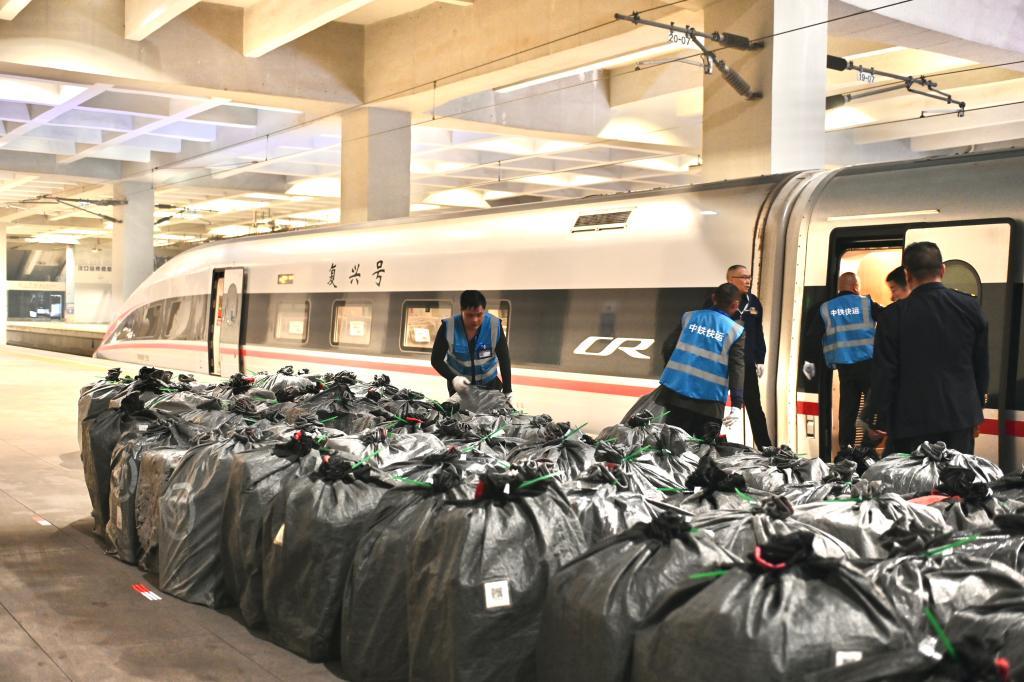 11月15日凌晨5时,汉口站站台上,已装袋整齐的服装、生鲜、电子产品等10吨快件有序摆放,铁路工作人员正将包裹搬进高铁车厢。当天,DJ892次和DJ890次高铁动车组列车分别从汉口站和广州白云站开出,华中地区与粤港澳大湾区新添高铁快运线路。