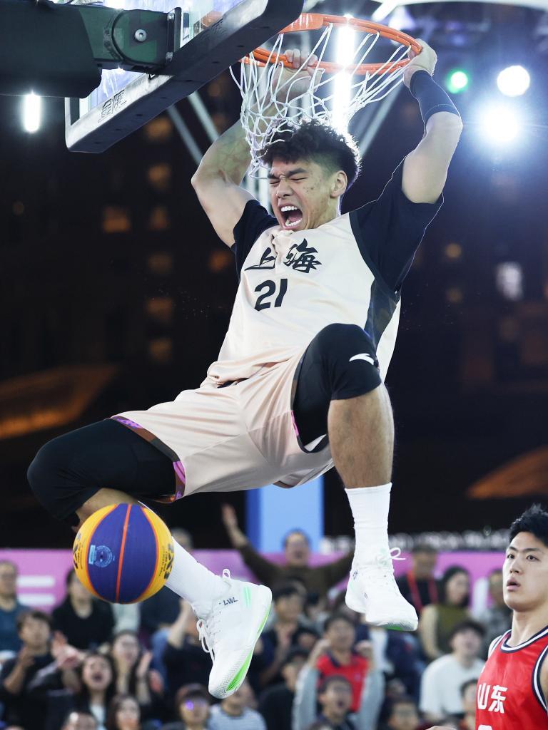 11月15日,上海队球员马典成在比赛中扣篮。新华社记者 孙凡越 摄