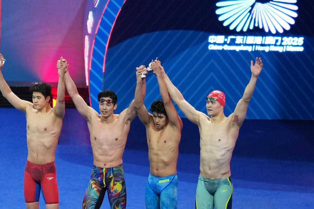 11月15日,浙江队选手潘展乐、汪顺、费立纬和孙杨(从左至右)在比赛后。浙江队获得亚军。新华社记者 丁增尼达 摄