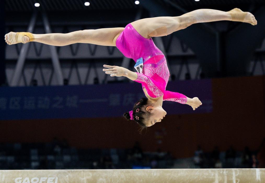 15日,在广东肇庆举行的第十五届全国运动会体操女子个人全能决赛中,广东队“10后”小将柯沁沁发挥出色,力压一众名将,以54.665分的总成绩夺冠。