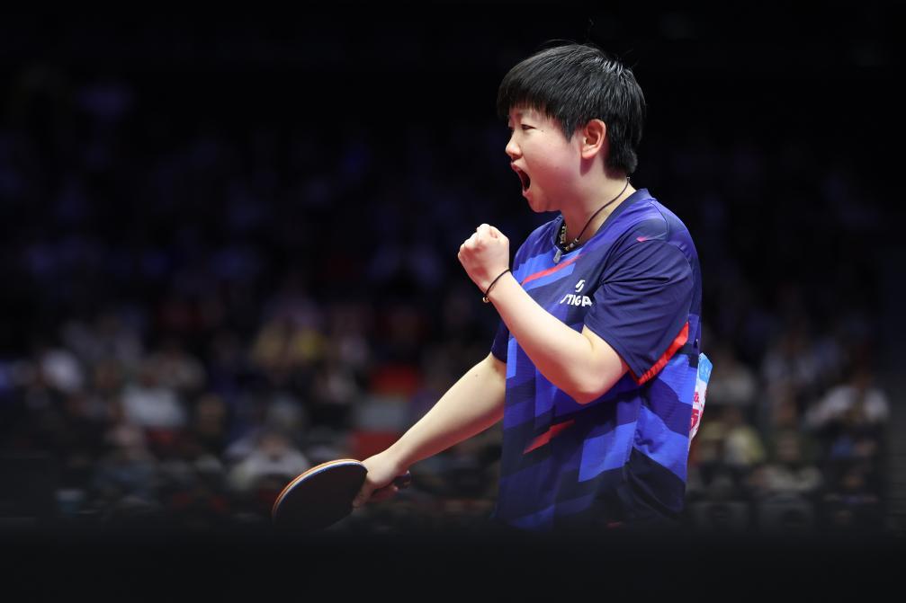 11月15日,河北队选手孙颖莎在比赛中庆祝得分。新华社记者 梁旭 摄