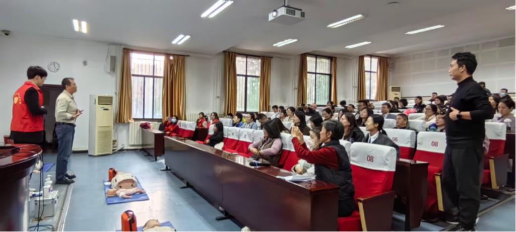 培训采用“理论+实操”相结合的模式,聚焦核心急救技能。魏文强详细拆解了心肺复苏术(CPR)的关键要点——按压位置、深度(5–6厘米)、频率(每分钟100–120次),并演示了成人海姆立克急救法的操作要领。他还就“是否先拨打120”“如何控制按压力度”等常见问题一一解答,并纠正了“烫伤涂牙膏”等错误做法,从急救基础、内科急症、创伤处置到实操演练五个方面,系统提升师生应急能力。