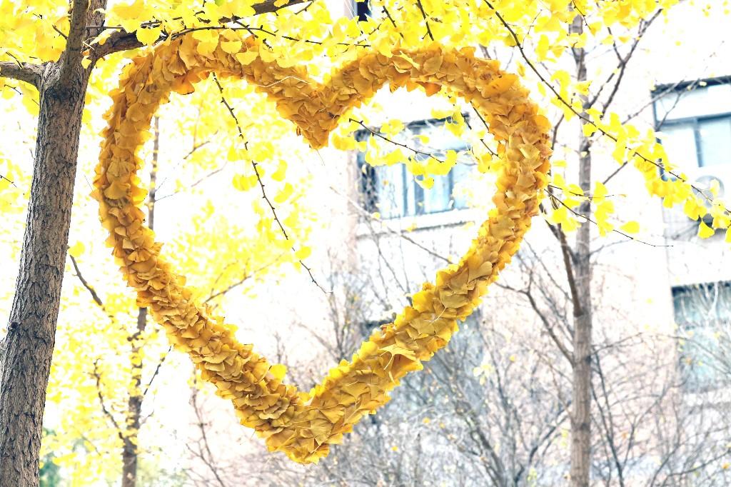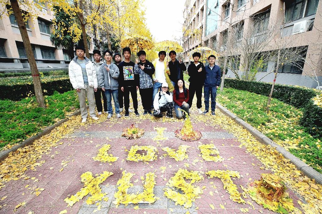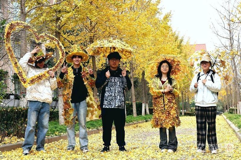 当日上午,遍地金黄落叶的校园成了天然课堂与秀场。师生们告别传统教室,俯身捡拾银杏叶、枫叶等自然馈赠,一场“变废为宝”的创意实践正式开启。同学们充分发挥巧思,有的将叶片拼贴成精巧画作,用树叶摆出醒目亮眼的“I LOVE XUST”图案;更有学子化身“环保设计师”,把枫叶、银杏叶精心搭配,制成造型别致的枫叶雨伞、秋叶帽子,还有用落叶串联而成的创意时装。走秀环节中,同学们身着落叶时装、手持枫叶伞、头戴秋叶帽,在金黄林间悠然漫步,灵动的造型与自然美景相映成趣,既展现了青春活力,更传递出“珍惜自然、循环利用”的环保理念。