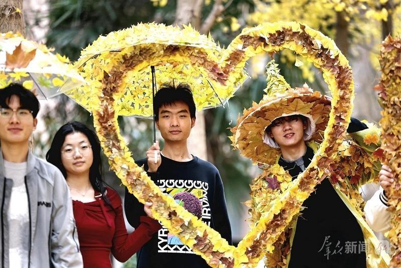 三秦都市报-三秦网讯(记者 阮班慧)身穿落叶时装,撑起枫叶伞,头戴红叶帽……悠然徜徉在层林尽染的诗意校园,青春时尚的气息扑面而来……11月16日,西安科技大学的校园热闹非凡,金黄的落叶不仅变身“灵性信笺”,更化作美丽的时装、创意的雨伞与时尚的帽子,一场充满创意的自然主题秀在此上演。该校化工学院开展的“诗意校园•化育匠心”主题活动,将美育、劳育与环保理念深度融合,让初冬校园的金黄美景多了别样温度。