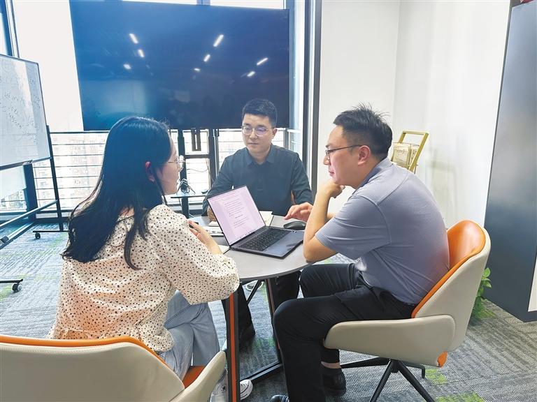 技术经理人鹿凡(右一)和团队成员沟通项目进度(资料照片)。 本报记者 郝颖摄