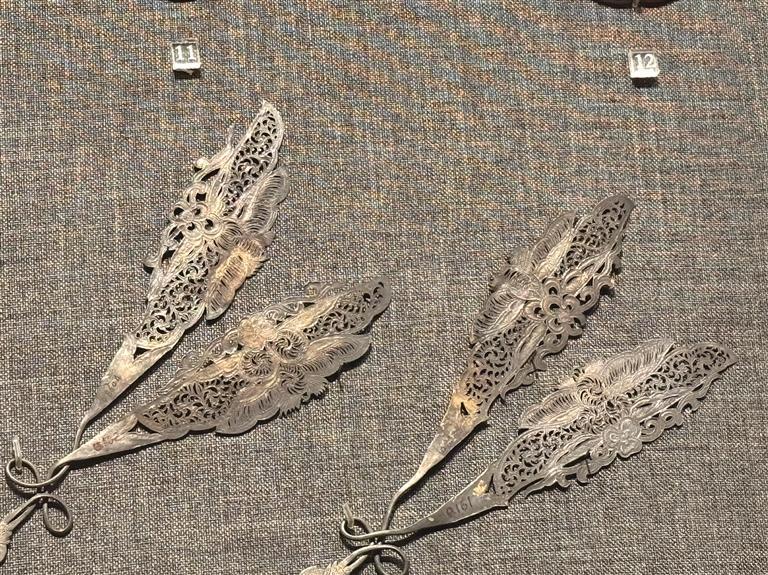 尽管历经千年岁月的洗礼,如今,这对鎏金蔓草蝴蝶纹银钗表面的鎏金已有斑驳脱落,原本的银质基底已氧化发黑,但它们本身的精致纹样依然细致如初。每一道蔓草的卷曲,每一片蝶翼的纹理,都在诉说着工匠的巧思与技艺。它们静静地躺在展柜中,让人想象出当年大唐盛世的繁华景象。