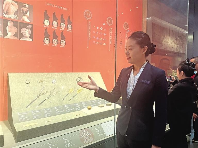 10月16日,陕西历史博物馆第三展厅人头攒动。左侧展墙上展示了唐代仕女的发型妆饰图解,下方文物展柜中展示着精致的首饰、铜镜等。随着讲解员的声音,游客的目光看向展柜中的一对发钗。“钗是古代女性用来固定、装饰发髻的实用工具。我们可以看到钗下端分作两股,和我们现在常用的U形夹一样。古人将自然的景致与匠心都錾刻在了钗首的方寸之间。”陕西历史博物馆社会教育部讲解员贾煦晨介绍,“鎏金蔓草蝴蝶纹银钗装饰考究、工艺精湛,钗首蝴蝶与蔓草纹的组合栩栩如生,是研究唐代金银器和服饰文化的重要实物资料。”
