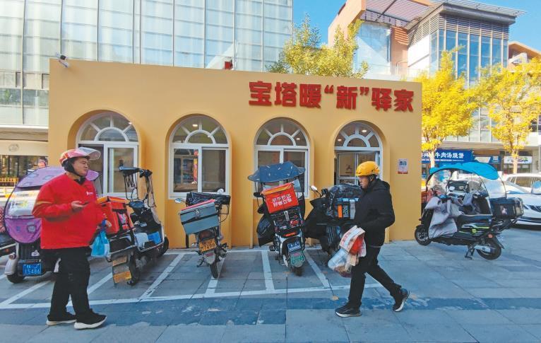 10月31日上午,延安市宝塔区新城街道桃园社区的吾悦广场商圈,虽然户外温度只有6摄氏度,但宝塔暖“新”驿家里暖意融融。不时有骑手走进这里,充电、喝水、歇脚。外卖骑手王凯说:“暖‘新’驿家对我们帮助特别大,解决了很多问题。”