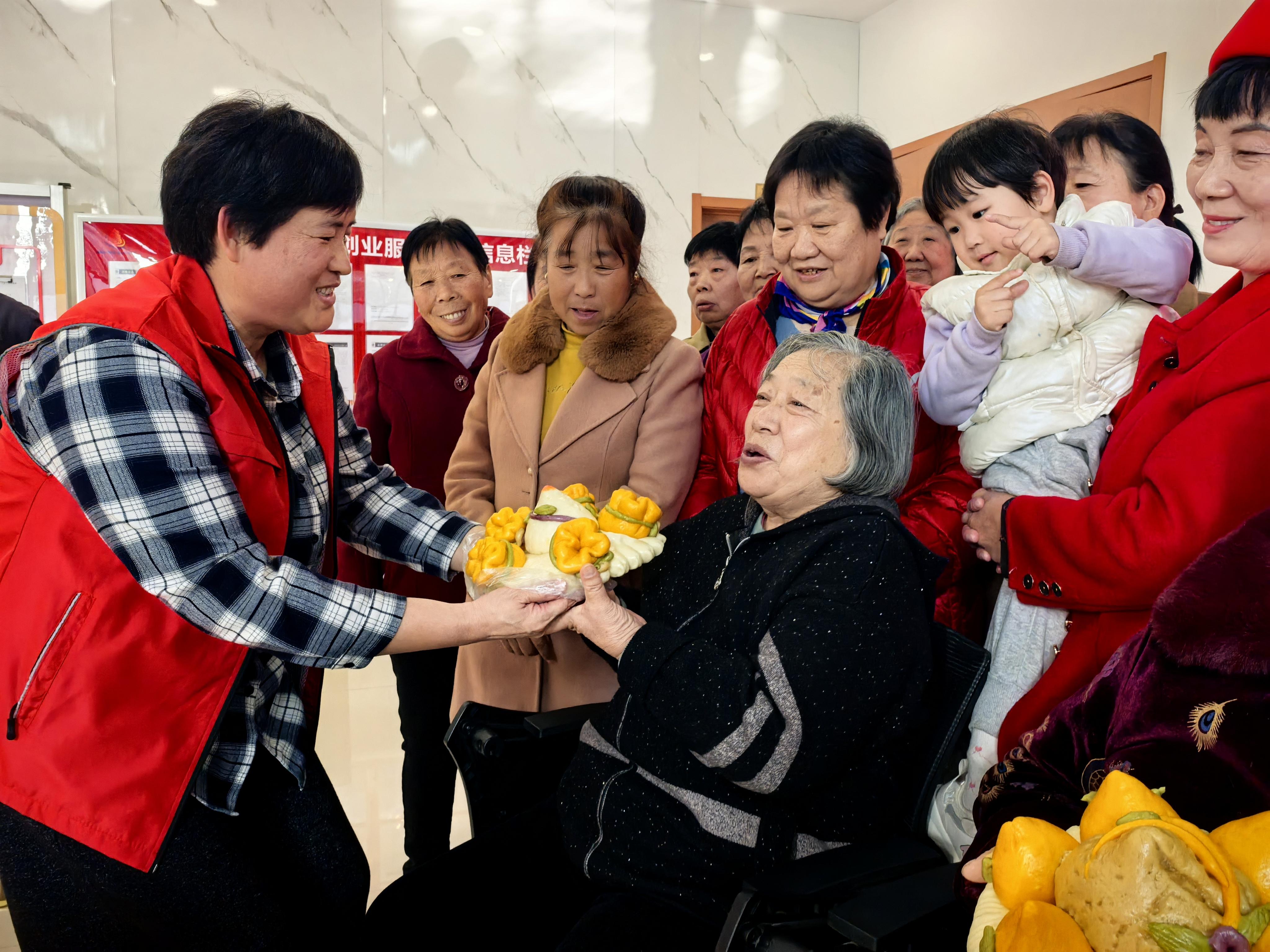 这场温馨生日会,源于一次入户走访的触动。王付英回忆,今年1月,社区工作人员在探望一位患病老人时,得知老人的心愿是“过一个有意义的生日”。考虑到老人患有疾病,不适合吃奶油蛋糕,大家一合计,那就做花馍,健康、无糖,还有文化味儿。