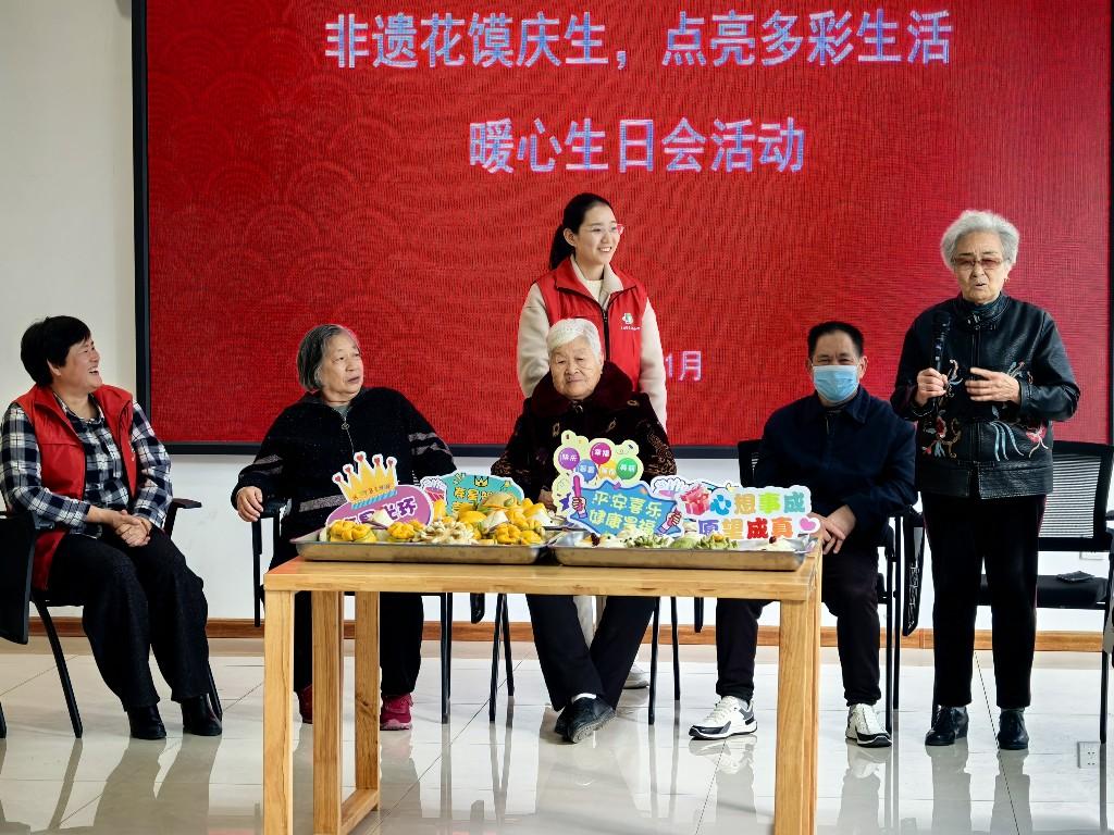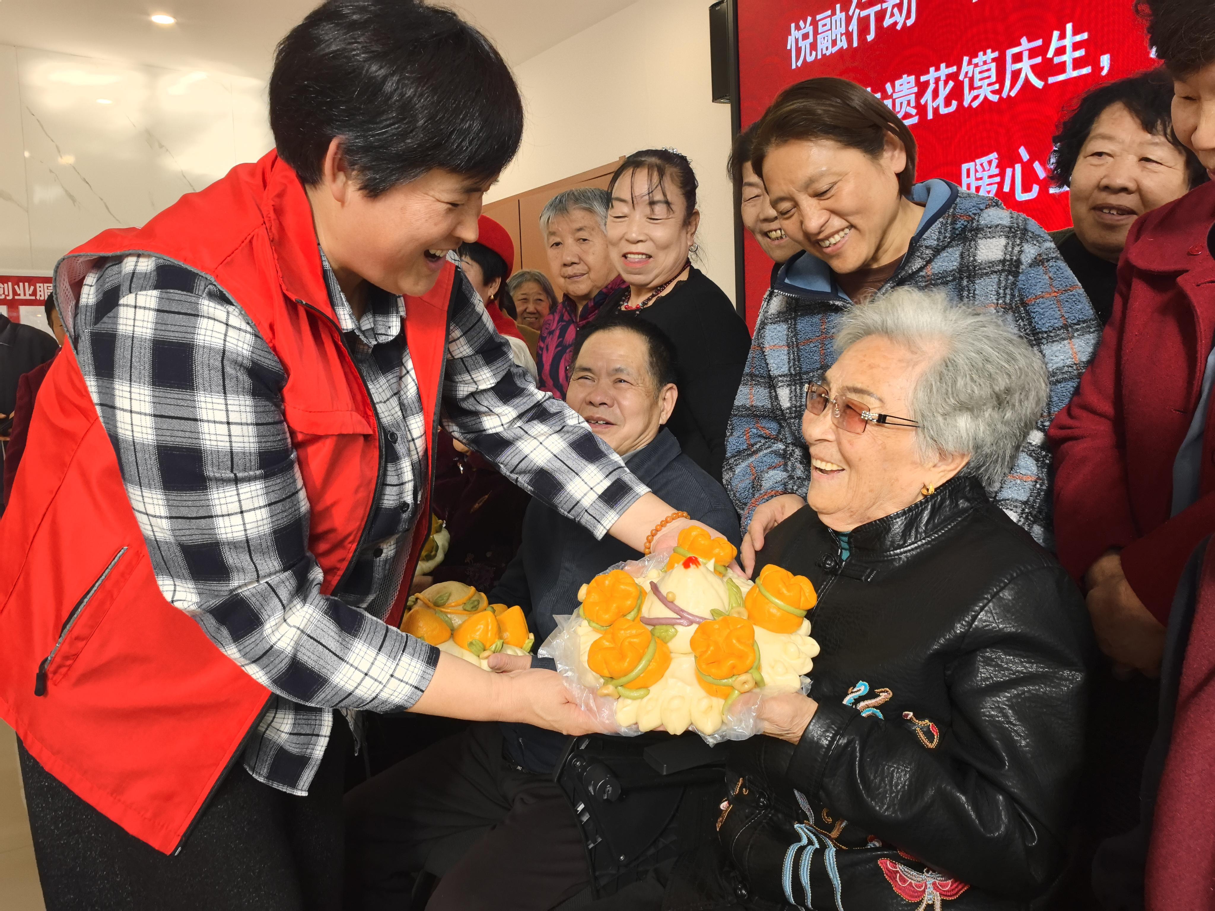 “用花馍替代蛋糕,既健康,又传承了非遗技艺!”该社区党支部书记、居委会主任王付英端起一盘花馍,笑容满面地向寿星们送上祝福,“祝大家生日快乐!”