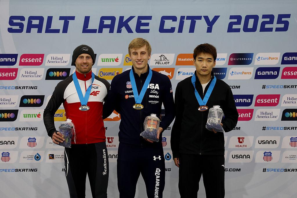 斯托尔兹(中)、茹雷克(左)和高亭宇在男子500米领奖台上合影。图源:国际滑冰联合会官网