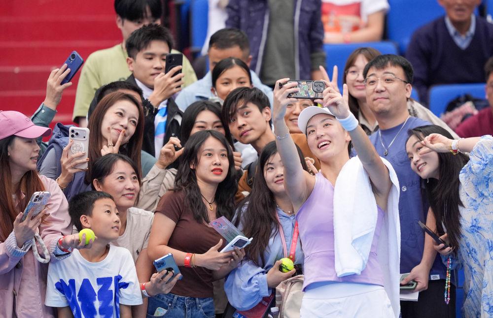 1号场地比赛结束后,以2:0取胜的王雅繁并没有立刻离场,而是留下来签名、合影,与观众互动了近十分钟。网球爱好者陈女士便是其中一员。2023年底,她曾在同一片场地看过珠海女子网球选手协会(WTA)超级精英赛。