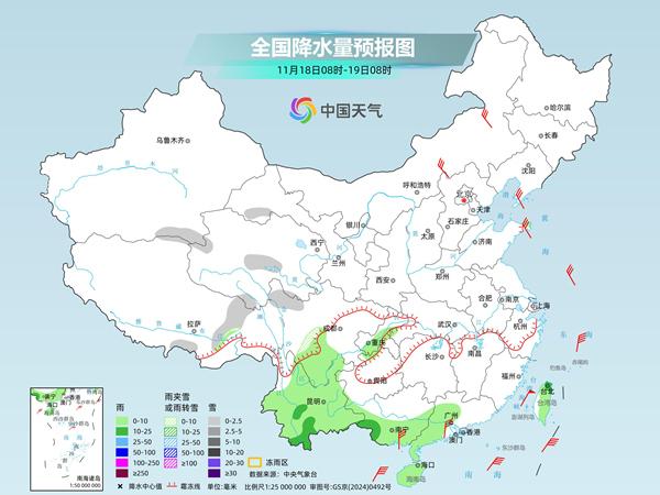 明天,西藏东部和南部、青海南部等地的部分地区有小雪或雨夹雪;重庆中南部、四川南部、云南、广西南部、广东西部、海南岛、台湾岛等地的部分地区有小到中雨。
