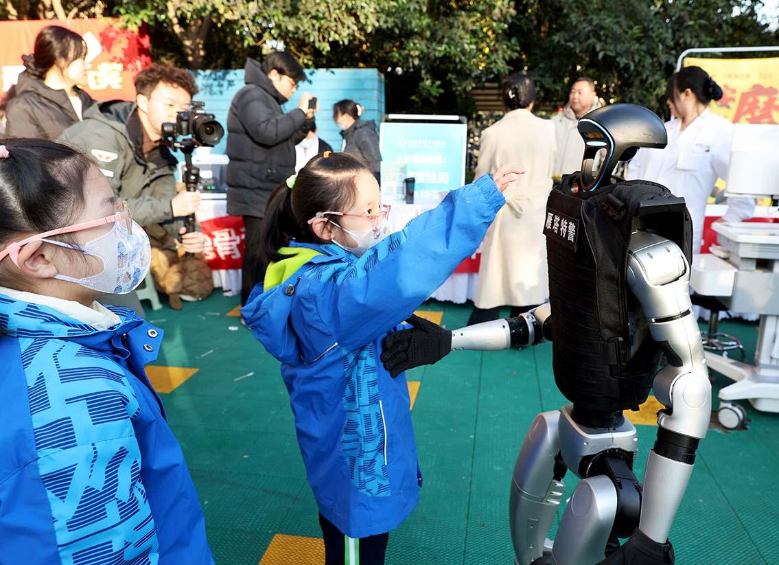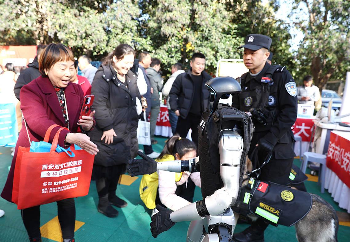 不远处,西安市公安局雁塔巡特警大队的警犬与智能机器人“笨笨”成为现场“明星”。2岁多的唐唐跟着奶奶,小心翼翼地向“笨笨”挥手,机器人感应后抬起机械臂“回应”,引得孩子咯咯直笑。据悉,“笨笨”不仅能与群众互动,还具备巡逻、站岗、协助开展简单警务咨询的功能。