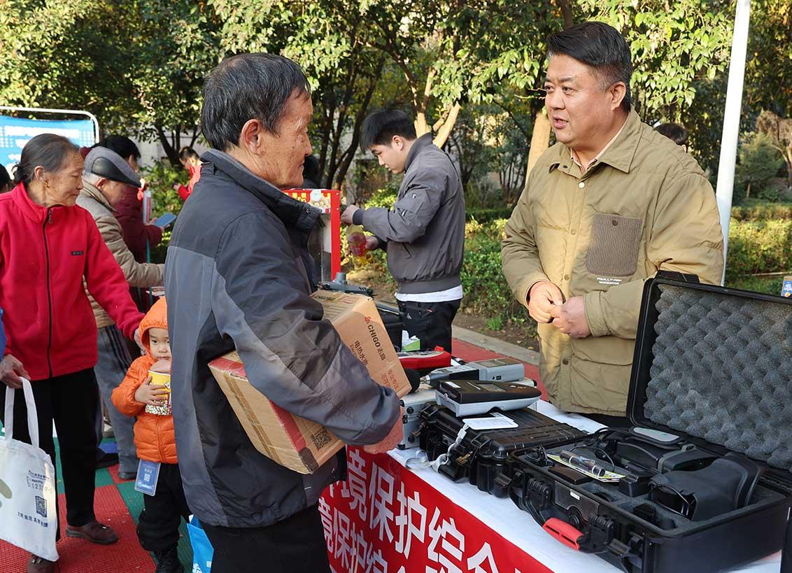 西安市生态环境保护综合执法支队雁塔大队的展位前,几台专业检测设备吸引了不少居民驻足。居民王子健手持仪器查看实时环境数据,“现在的AQI是26,属于优级标准。”西安市生态环境保护综合执法支队雁塔大队副大队长董宝生在一旁介绍,展台上的“有机废气检测设备”能捕捉无色无味的挥发性有机物,“PM2.5/PM10在线监测设备”可现场实时反馈数据。