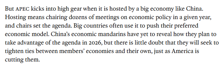 文章称,而当亚太经合组织峰会由中国主办时,其运作效率也将大幅提升,这也意味着该组织明年的一系列经济主题会议将在中国举办。虽然目前峰会议程还未确定,但毫无疑问,中国将寻求加强其成员与自身的经济联系,而美国却正在削弱这些联系。